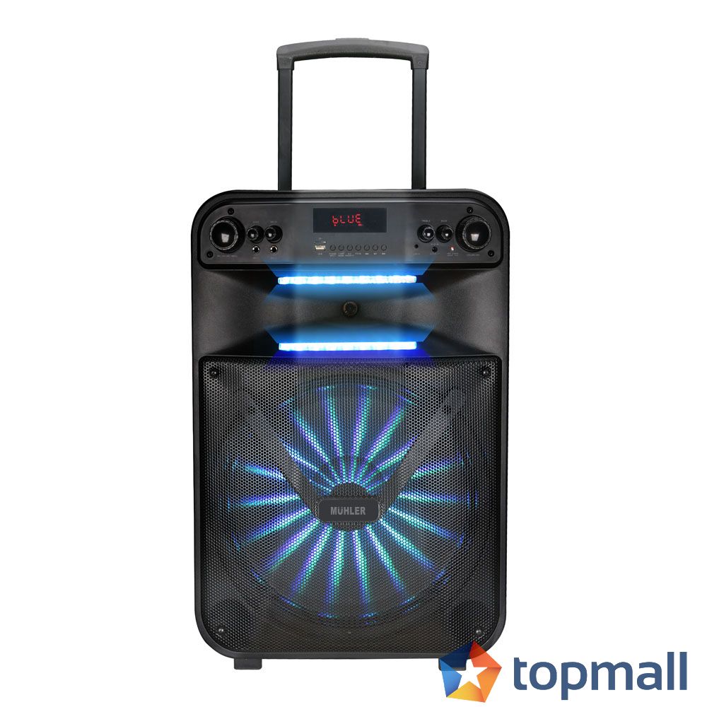 Активна тонколона Muhler MAX150R; Говорители: 15"+1''; Функции: USB/TF слотове, FM радио, Bluetooth; Цветно осветление; Дръжка и колелa; Батерия: 12V/7000mA; Честотна характеристика: 38Hz-20kHz; Съпротивление: 4oHm; Мощност: 80W; Аксесоари: Адаптор за зареждане, 2бр. безжичен микрофон; Цвят: Черен; Нето тегло: 12.65kg; Бруто тегло: 14.53kg; Размери (ШхВхД): 430x685x405mm; Размери опаковка (ШхВхД): 476x725x436mm; Гаранция за физически лица: 2 години;