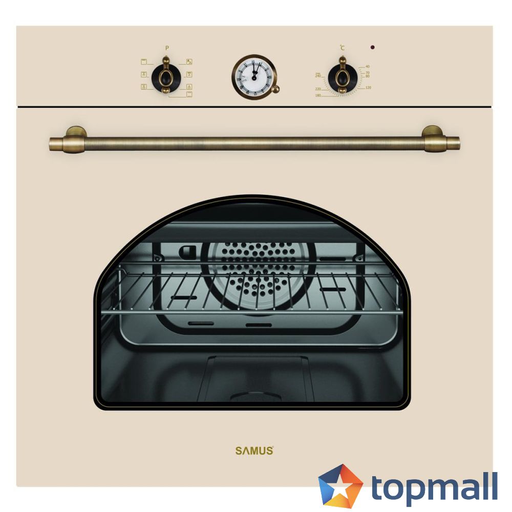 Елегантна фурна за вграждане с бежов винтидж дизайн и метални ретро дръжки, съчетаваща класическа визия с модерни функции. Разполага с капацитет от 56 литра и 7 различни функции за готвене, включително вентилатор за равномерно разпределение на топлината.