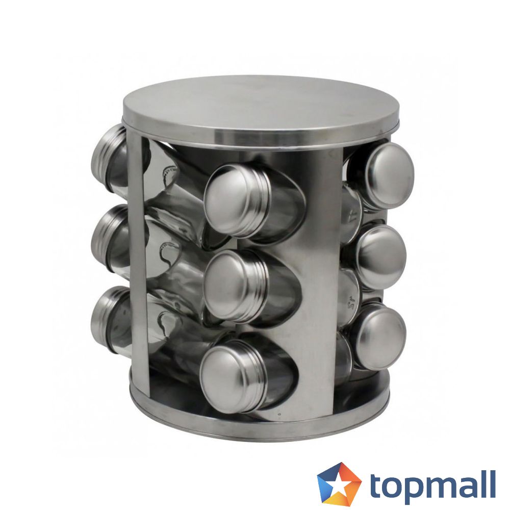- Поставка за подправки от неръждаема стомана (Inox)- 3 нива- 12 бр стъклени бурканчета с капачки от неръждаема стомана- Въртяща се основа- Капацитет на бурканче: 80 мл- Височина на стойката: 19 см- Диаметър на стойката: 17 см