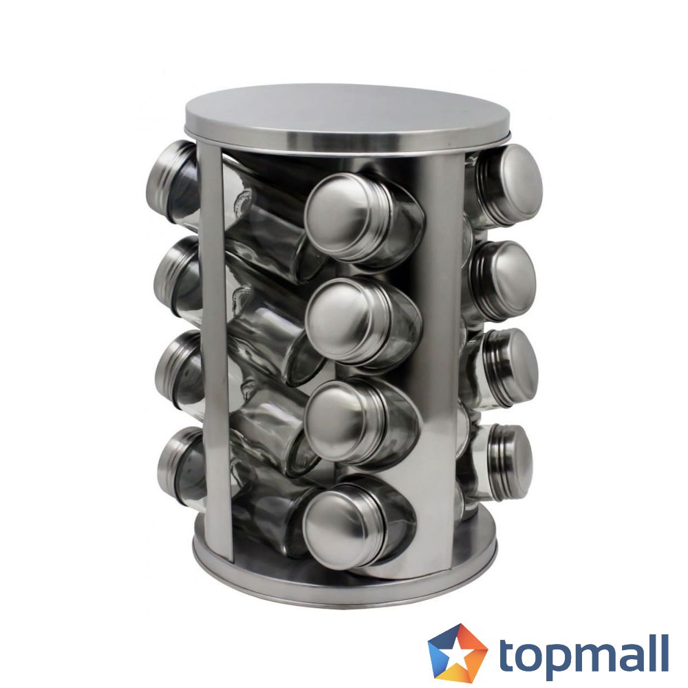 - Поставка за подправки от неръждаема стомана (Inox) - 4 нива - Въртяща се основа - 16 бр стъклени бурканчета с капачки от неръждаема стомана - Капацитет на бурканче: 80 мл - Височина на бурканче: 9 см - Диаметър на бурканче: 4 см - Височина на стойката: 25 см - Диаметър на стойката: 17.1 см