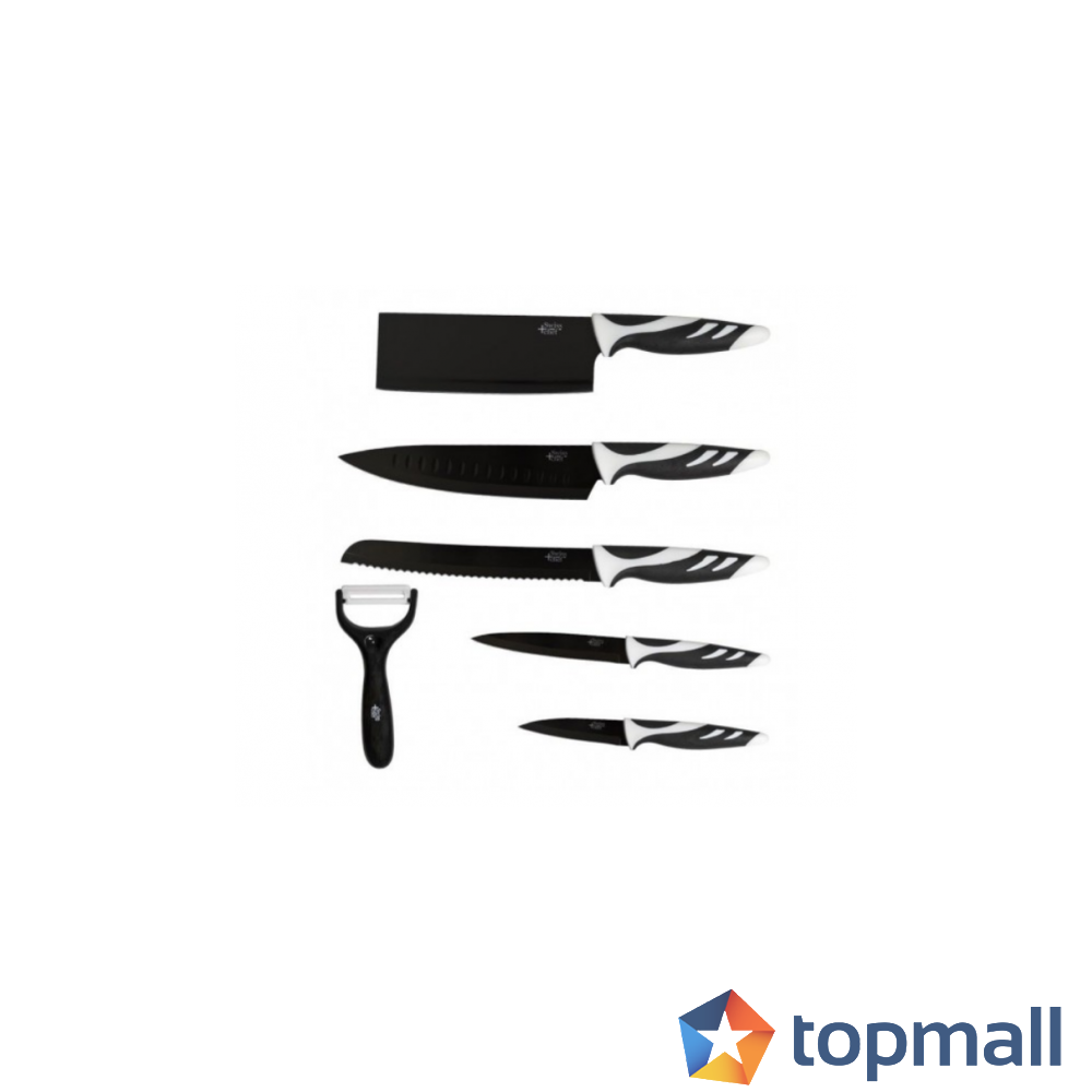 Черни професионални ножове в швейцарски стил. Комплект 6 части. Дебело острие: 2 мм. Изработен от неръждаема стомана и керамичен емайл. Нехлъзгаща се и удобна дръжка за подобряване на сцеплението. Незалепващо и антибактериално покритие. Гладка повърхност на острието за лесно почистване.