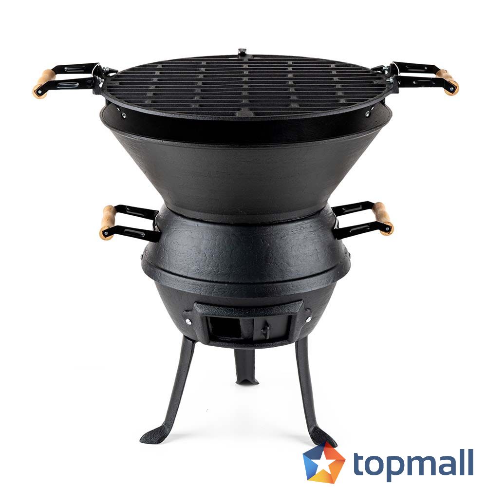 Подходящo за печене на дървени въглища при излети и пътувания, не е подходящо за професионална употреба. С капацитет на количеството храна до 4 души, висока здравина и идеално за гриловане на месо, зеленчуци и други. Дървени дръжки на скарата за по-голямо удобство и безопасност - предпазва от изгаряне. Конструкцията на барбекюто дава възможност да се регулира височината на позицията на решетката, така че може да печете на по-интензивна температура или на по-слаб огън. С опция за регулиране потока на въздуха, така че да имате контрол върху силата на огъня. Със стабилни крака и удобни ненагряващи се странични дръжки за пренасяне. Размери на барбекюто: Ø37xH48cm Диаметър на скарата: 37cm Скара и тяло, изработени от чугун - разпределят развномерно топлината, нагряват се по-бавно, но дълго отдава топлина.