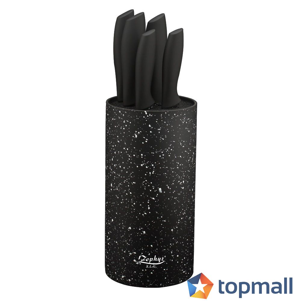 Комплект ножове ZEPHYR ZP 1633 VM6, 5 броя + поставка, Мраморно покритие, Черен
