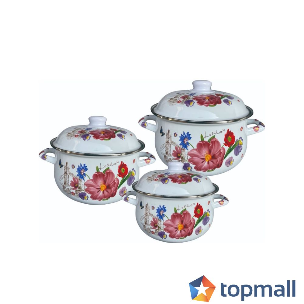 Комплект тенджери Rosberg R54518H3, 6 ч, Eмайлно покритие, Стоманен капак, Индукция, Принт на цветя, Бял, (22111)