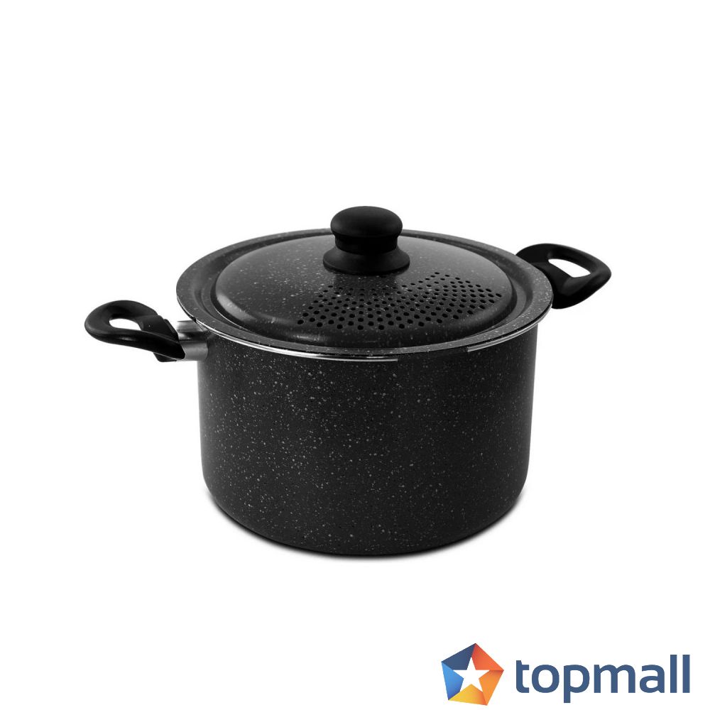 Тенджерата за паста от Royalty Line с прецеждащ капак в черен цвят притежава изключителен дизайн, който позволява лесното приготвяне и отцеждане на пастата. Този съд не само е модерен, но и неговата алуминиева структура с незалепващо покритие отвътре и лесно почистващо се покритие отвън го правят достатъчно издръжлив и ефективен за ежедневна употреба. Тенджерата е оборудвана с две бакелитени дръжки, което я прави удобна за употреба и пренасяне.