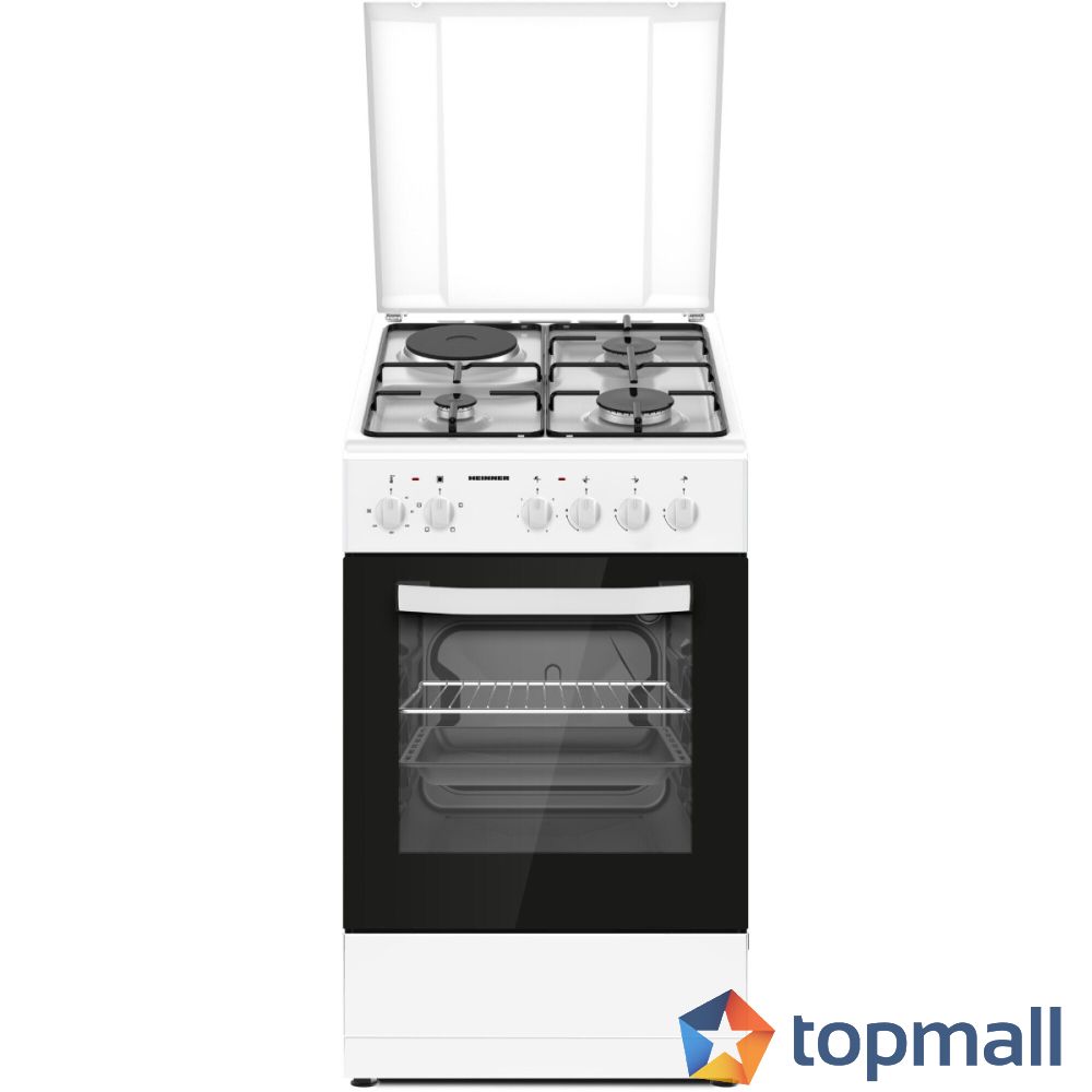 Heinner HFSC-S56E1HSWH комбинирана готварска печка, 3 газови котлона + 1 електрически котлон, електрическо запалване на горелката, електрическа фурна, клас А, грил, 50x60 см, бяла