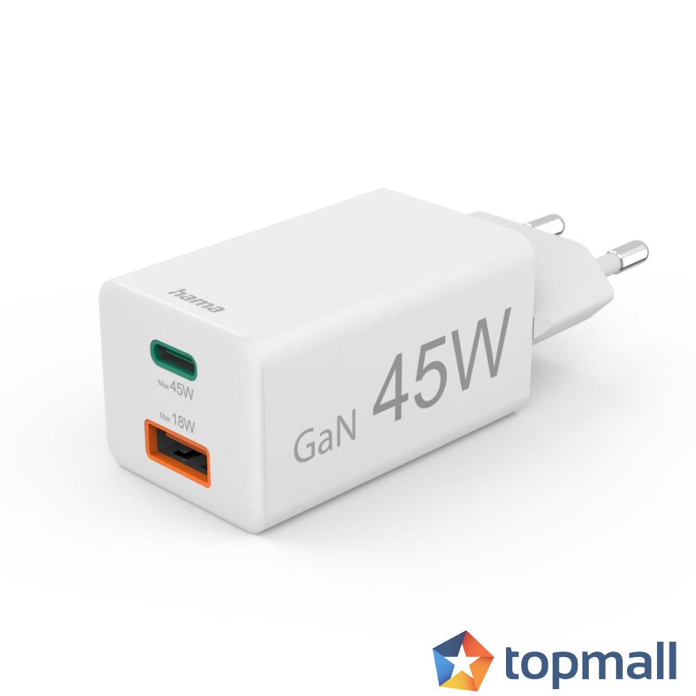 HAMA Бързо мини зарядно, 45 W, 1x USB-C - 1x USB-A, PD, бяло, (35939578)