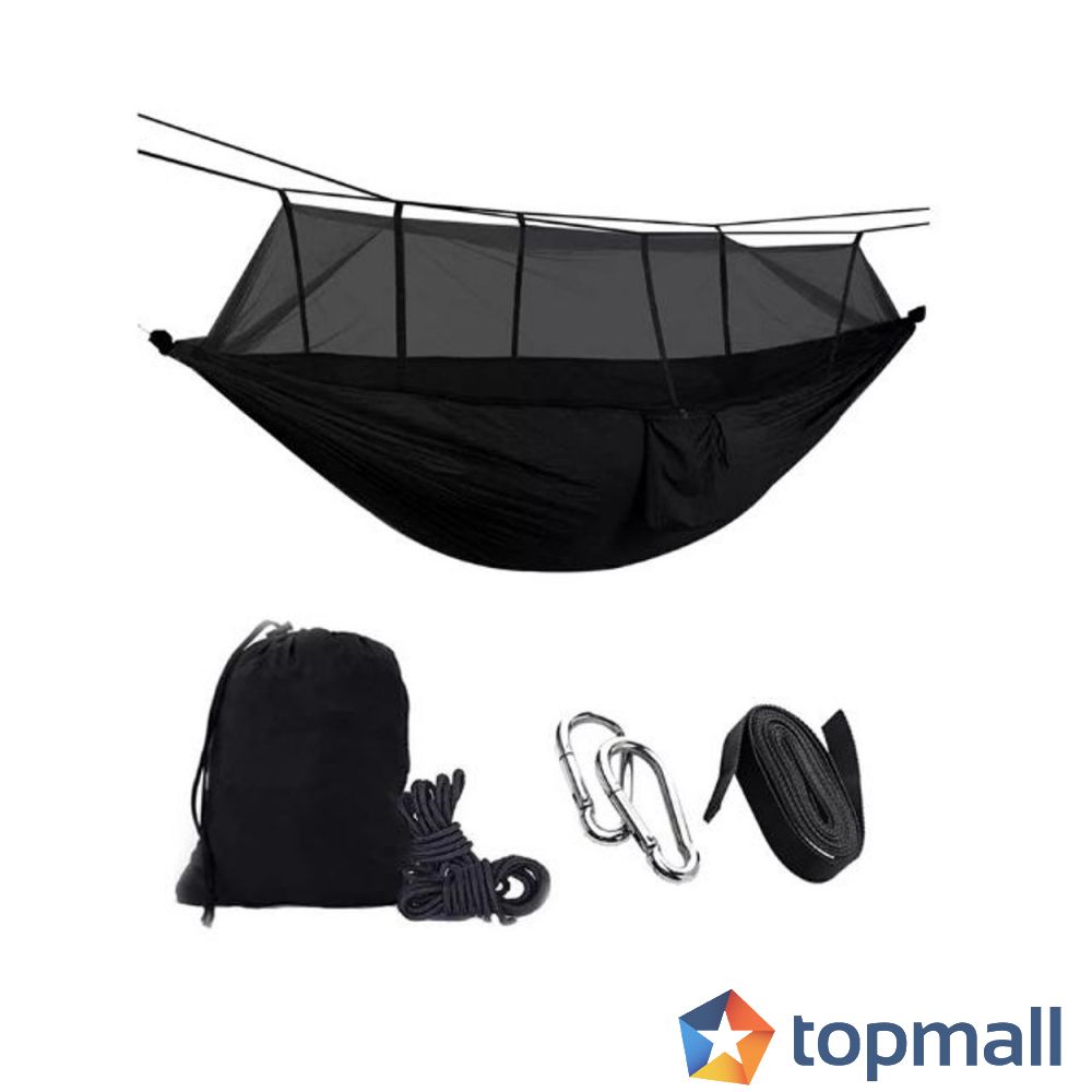 Предимства на Хамак с мрежа против насекоми черен AG233I : Туристическият хамак е изработен от издръжлив найлон и полиестер. Устойчив на сурови метеорологични условия! Осигурява отлична защита срещу насекоми благодарение на мрежата против комари. Ще осигури перфектна почивка на умореното тяло. Просто го окачете в градината или на терасата и се насладете на дейности на открито. Комплектът включва калъф за съхранение на хамака. След като се навива и прибира в чанта, заема малко място - лесно се побира в малка раница! Включва конци за закрепване на хамака към дървото и други стълбове.