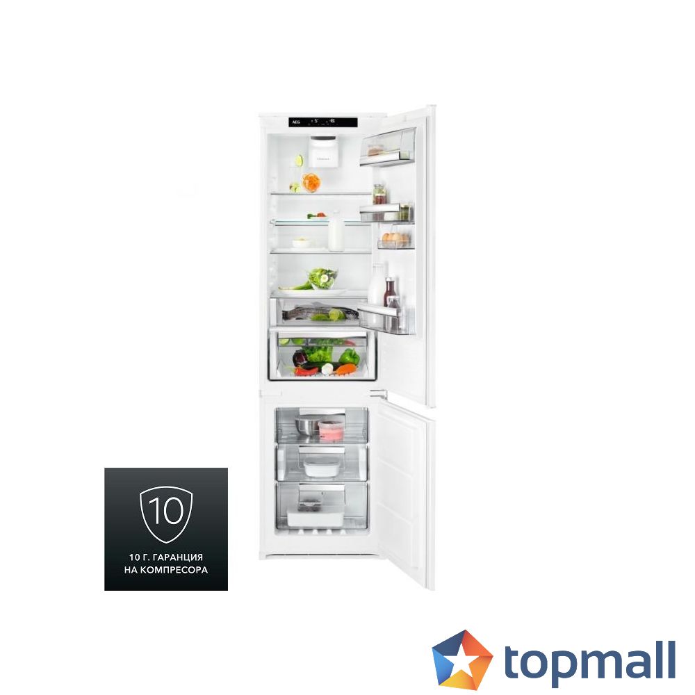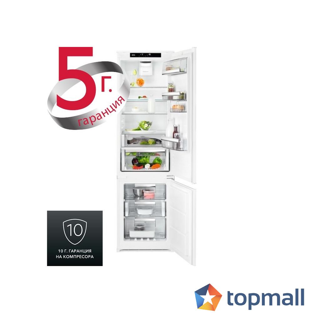 AEG SCB819E8TS Хладилник с фризер за вграждане No Frost (без обледяване) Хладилникът MultiSpace предоставя допълнителен капацитет и повече гъвкавост. Комбинираният хладилник с фризер MultiSpace 8000 Ви предоставя повече капацитет от стандартните модели чрез допълнително място за съхранение в горната част на уреда. С регулируема вътрешна част, този хладилник е най-универсалният начин за съхранение на продукти. Допълнителен капацитет, височина и гъвкавост при съхранението с MultiSpace. Хладилникът MultiSpace на AEG предоставя повече капацитет от стандартните модели чрез допълнително място за съхранение в горната част на уреда. С регулируема вътрешна част, този хладилник е най-универсалният начин за съхранение на продукти. Насладете се на десет години спокойствие с новата гаранция на инверторния компресор. Десетгодишната гаранция на инверторния компресор Ви осигурява максимално спокойствие. Гаранцията включва разходи за труд, транспорт, отстраняване и зареждане с газ, обща поддръжка и сервизни разходи. Персонализирайте настройките на хладилника с електронно сензорно управление Dual Touch. Поемете пълен контрол над всяка функция на хладилника с електронното сензорно управление Dual Touch. Панелът и LED дисплеят предлагат лесен достъп до температурните и общите настройки. Прецизирайте всичко с точност за превъзходно съхранение на Вашата храна. Вашето специално място ExtraZone за различни видове храни. Поддържайте хладилника си подреден и избягвайте смесването на различни видове храни. Чекмеджето ExtraZone е идеално за съхранение на свежите храни на достъпно място по всяко време. Вътрешното LED осветление достига до всеки ъгъл. Вътрешното LED осветление придава дискретна светлина, разпределена равномерно в цялото пространство. Освен това LED крушките са по-малки и по-енергоспестяващи от стандартните крушки – Вашият по-екологичен избор.