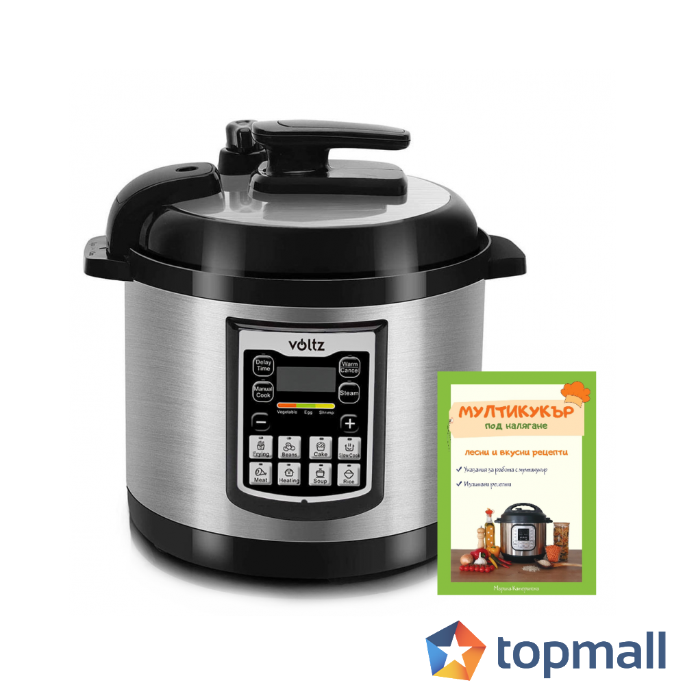 Оценете:Комплект мултикукър под налягане Voltz V51985A6 и книга с рецепти, 1000W, 12 програми, Таймер, LED дисплей, Инокс/черен, (CMPMLTCRA6)