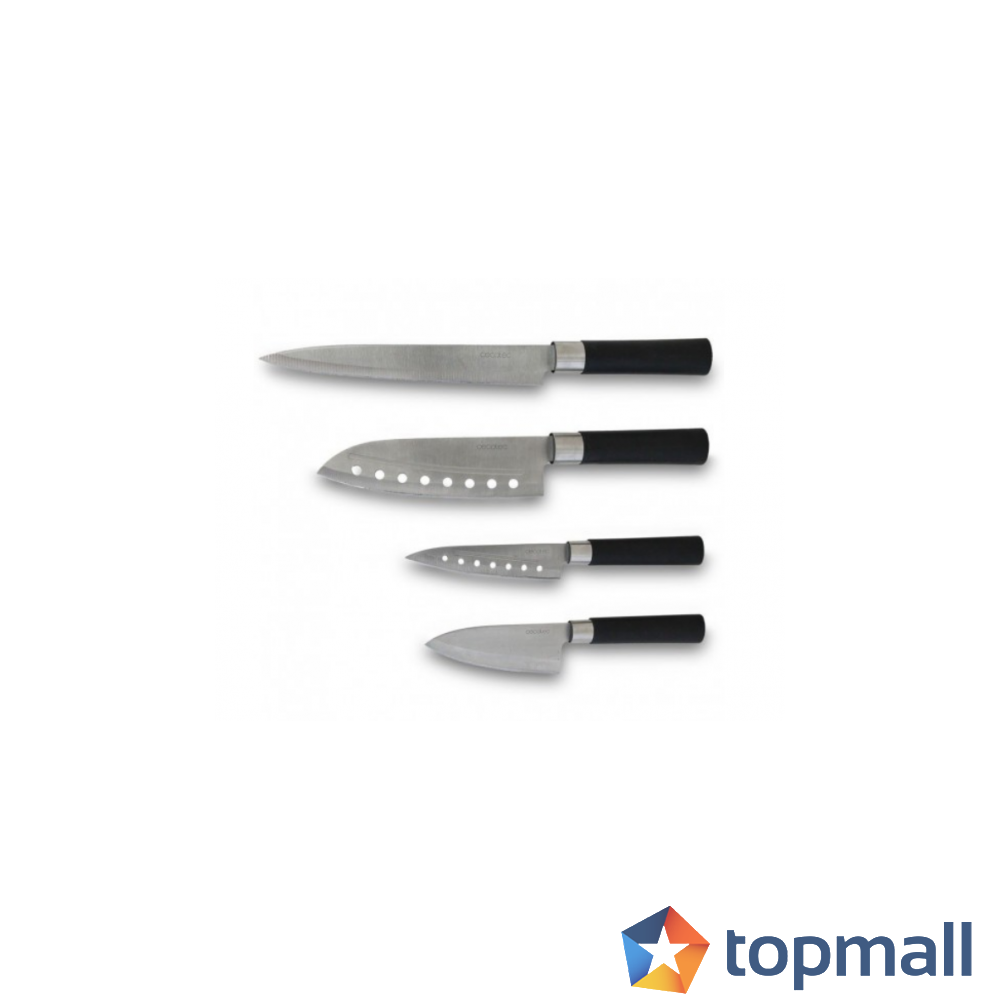 4 професионални ножа. Oстрие с отвори: 2 мм. Изработени от неръждаема стомана. 3Cr13 с високо съдържание на въглерод. Полипропиленова дръжка. Възможност за измуване в съдомиялна машина, но се препоръчва ръчно чистене. Santoku японски дизайн.