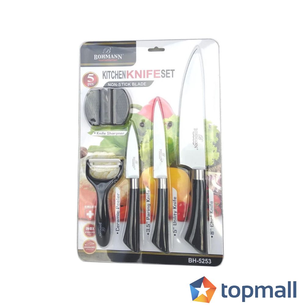 Комплект ножове Bohmann BH 5253, 5 части, Белачка и точило, Черен/бял, (9999BH5253)