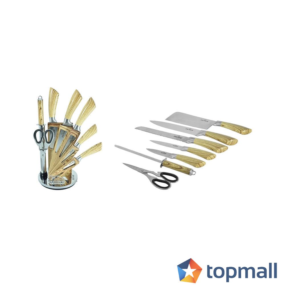 Комплект ножове с поставка ZILNER ZL 5122, 8 части, Точило, Ножици, Неръждаема стомана, Дървена дръжка, (18387)