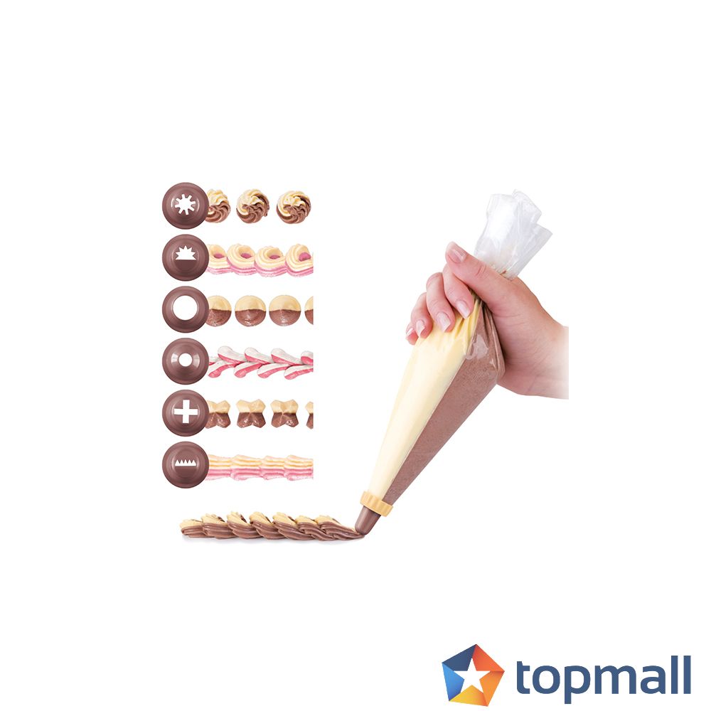 Предназначен за декориране в два цвята и пълнене За ползване с пластмасови накрайници DELICIA - отрежете около 4cm от връхчето на плика За декориране без накрайник - скъсете връхчето на плика Включва 6 накрайника и торбичка с две отделения Изработени от устойчива пластмаса Дължина: 30cm