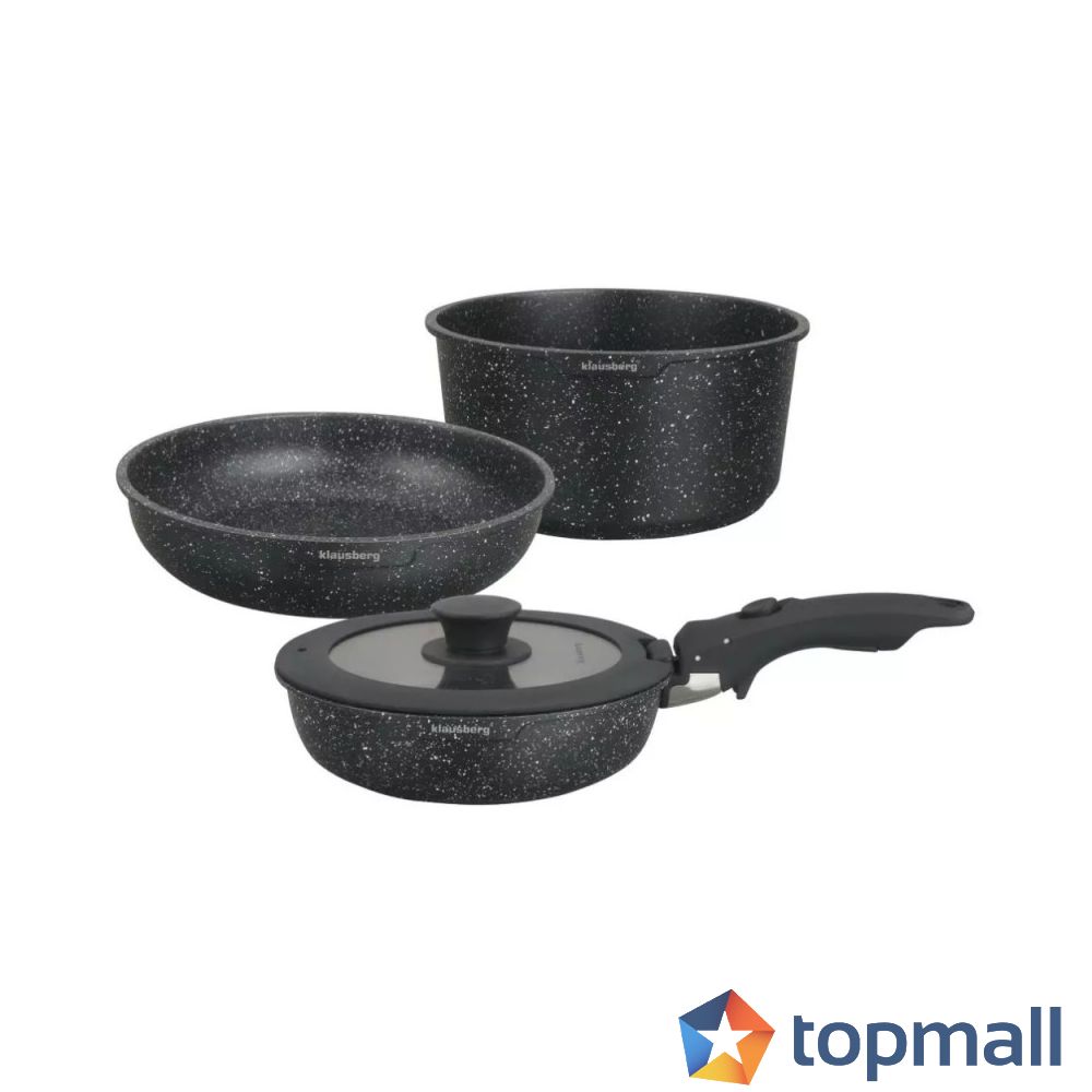 Комплект съдове за готвене Klausberg KB 7858, 5 части, Стъклен капак, Универсална дръжка, Мраморно покритие, Индукция, Черен, (35930876)