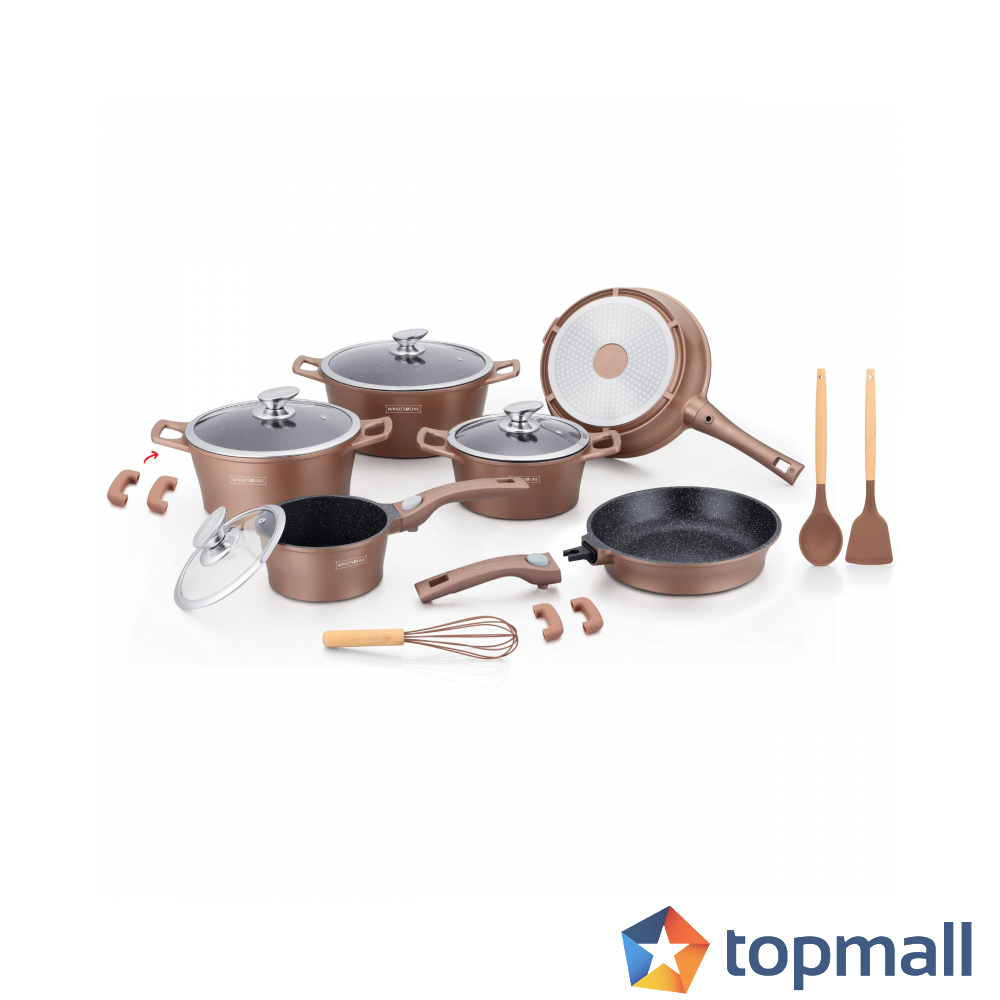 Комплект тенджери и тиган Royalty Line RL-ES2014M, 17 части, Мраморно покритие, Индукция, Меден цвят, (35946352)