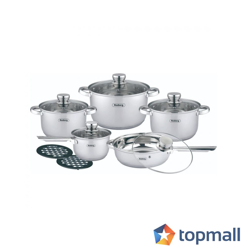 Комплект тенджери и тигани Rosberg R51210L12BM, 12 части, Многослойно дъно, Неръждаема стомана, Сребрист, (35940361)
