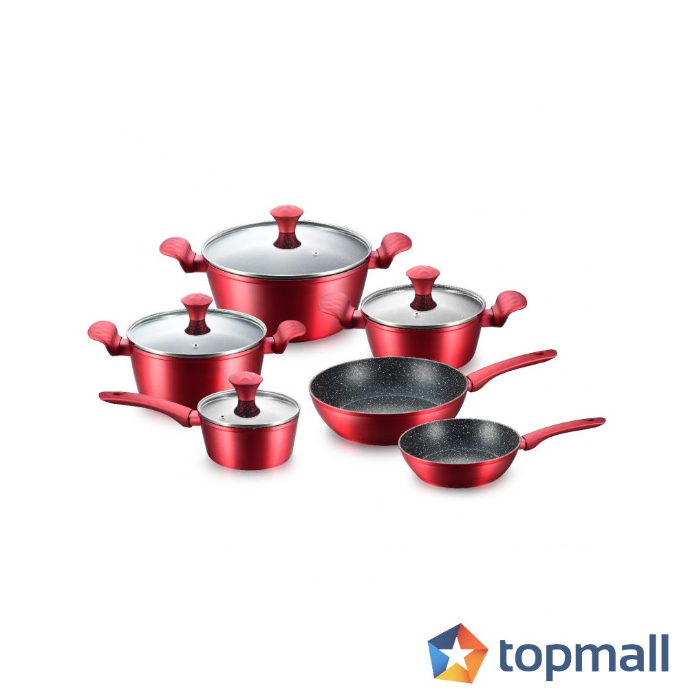 Комплект тенджери и тигани Royalty Line FD10, 10 части, Лят алуминий, Greblon мраморно покритие, Индукция, Червен, (35945594)