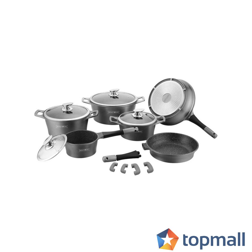 Комплект тенджери и тигани Royalty Line RL-ES1014M Silver, Лят алуминий, 14 части, Мраморно покритие, Сребрист, (35945597)
