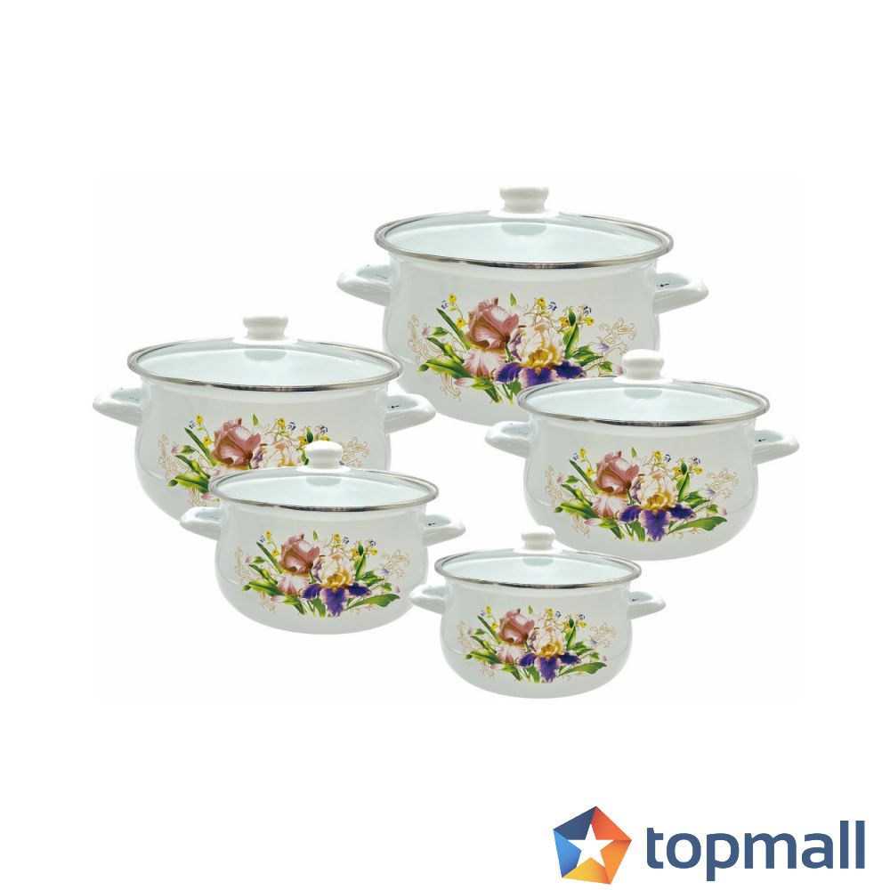 Комплект тенджери Rosberg R54518D5G, 10 ч, 2.2-6.3 литра, Емайл, Стъклен капак, Индукция, Бял с цветна шарка, (17752)