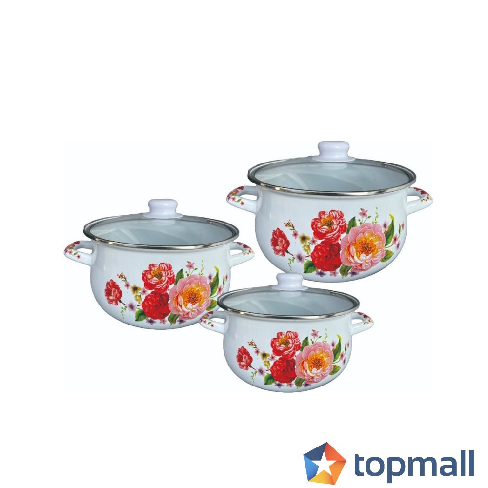 Оценете:Комплект тенджери Rosberg R54518F3G, 6 ч, Eмайлно покритие, Стъклен капак, Индукция, Цъфнали рози, Бял, (22116)