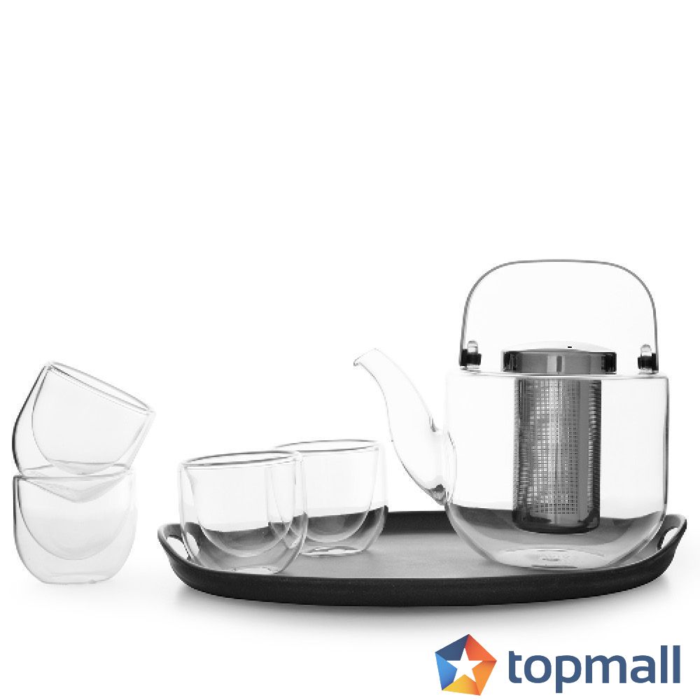 Комплектът съдържа: - чайник с цедка и удобна дръжка - 1 брой с вместимост 650ml Подходящ за директно употреба върху котлон - чаши за чай с двойни стени - 4 броя с вместимост 50ml Изработени от боросиликатно стъкло, което издържа на нагряване до - поднос от бамбук - 1 брой с размери: 26x24.8xH2.8cm Подходящ за почистване в съдомиялна машина (без подноса)