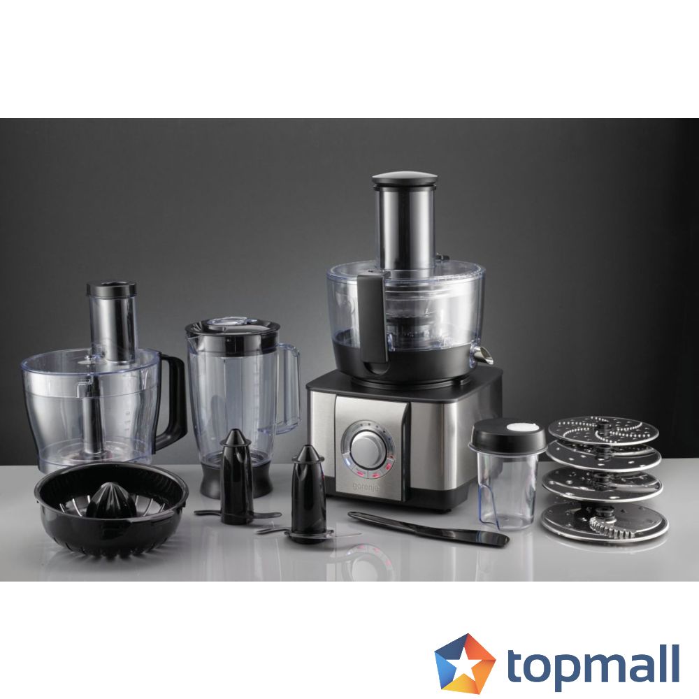 Тази многофункционална кухненска машина на Gorenje с множество ножове и различни приставки може да свърши почти всичко. Тя идва с множество ножове, кани, купи за смесване и рязане и различни приставки за нарязване, нарязване на кубчета, рязане, месене, смилане, разбиване, смесване и смилане.