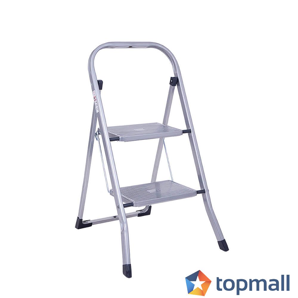 Метална стълба с две оребрени стъпала Размер на стъпалата: 30x20 Височина от основата до второ стъпало 47cm Размери: 90x48x5.5cm, 4.4kg Максимален товар 150kg Предпазен заключващ се механизъм Удобна за съхранение Цвят: сребриста рамка с пластмасови елементи в антрацит