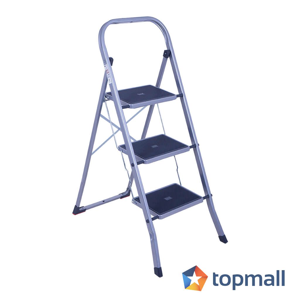 Метална стълба с 3 стъпала с гумирано покритие Размер на стъпалата: 30x20 Височина от основата до трето стъпало: 70cm Размери: 116x48x6cm, 6.6kg Максимален товар: 150kg Задна рамка, усилена X-система за допълнителна безопасност Удобна за съхранение Цвят: сребриста рамка с пластмасови елементи в антрацит
