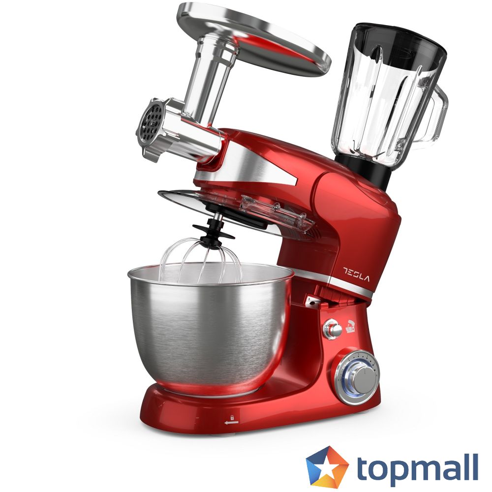 Кухненски робот със стоманена купа Tesla KR600RA, 1000W, 5 литра, Блендер, Миксер, Месомелачка, Червен металик, (9512)