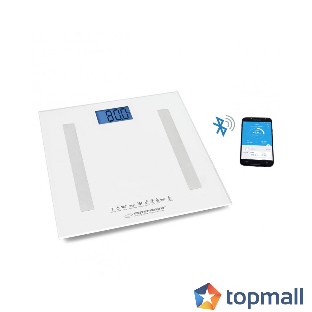 Мултифункционален кантар 8в1 Esperanza EBS016W, 180 кг, Анализатор на тялото, Bluetooth, Стъкло, LCD екран, Бял, (35922787)