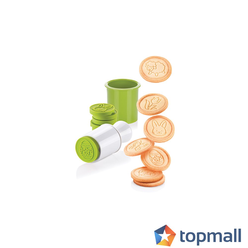 Предназначен за лесно приготвяне на декорирани домашни сладки от маслено и джинджифилово тесто. Комплектът включва печат, 6 сменяеми приставки с различни декори и кръгъл резец. Приставките се съхраняват в кутийката на печата Изработени от устойчива пластмаса. Размери: Ø5.5xH12.5cm Подходящи за почистване в съдомиялна машина Гаранция за физически лица: 3 години