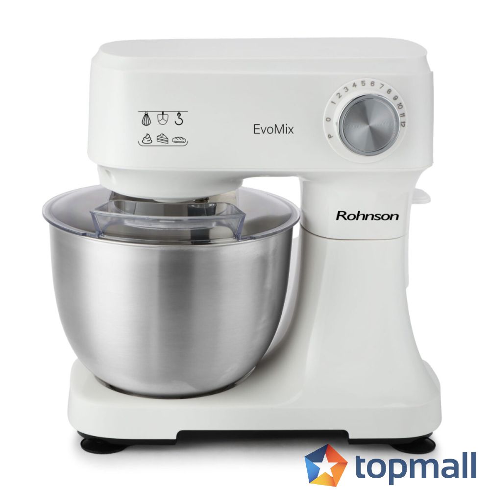 Планетарната система на разбъркване гарантира перфектно обработване на тестото от всички страни на купата. Роботът е оборудван с три приставки – кука за месене, бъркалка за разбиване и бъркалка за смесване – което го прави подходящ за универсална употреба във всяка кухня.
