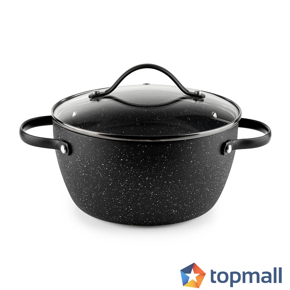 Висококачествен кован алуминий - за бързо и равномерно награвяне на повърхността Дебелина на стената - 3.5 mm Дебелина на дъно - 4 mm Незалепващо покритие с мраморен ефект Дръжки от неръждаема стомана с PVD покритие в черно Подходящ за: електрически, газови, стъклокерамични, халогенни и индукционни котлони Подходящ за използване във фурна Подходящ за съдомиялна машина Подходящ за здравословно готвене без мазнина Лесно почистване