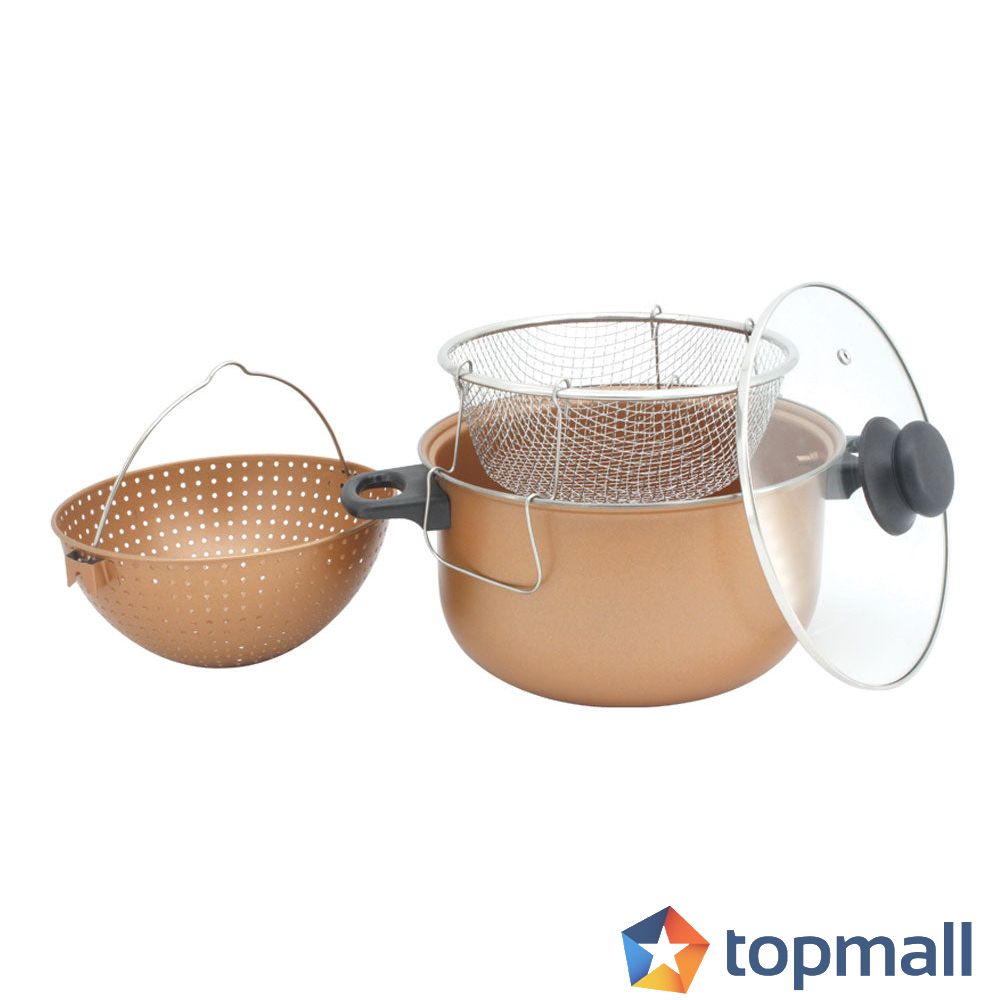 Комплект тенджера с кош за пържене и цедка, въглеродна стомана, незалепващо покритие, меден цвят.