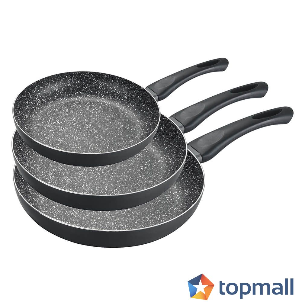 Комплектът съдържа: Тиган 20x4 cm Тиган 24x4.5 cm Тиган 28x5 cm Пресован алуминий за равномерно разпределение на топлината Висококачествено незалепващо покритие с мраморен ефект Подходящи за електрически, газови, стъклокерамични котлони Използвайте найлонови, дървени или силиконови прибори Подходящи за съдомиялна машина