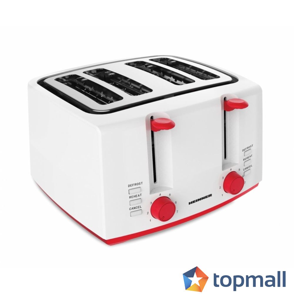 Тостер HEINNER HTP-1300WHR, За 4 филии, 7 степени, Функция затопляне и размързяване, Бял/Червен, (21362)