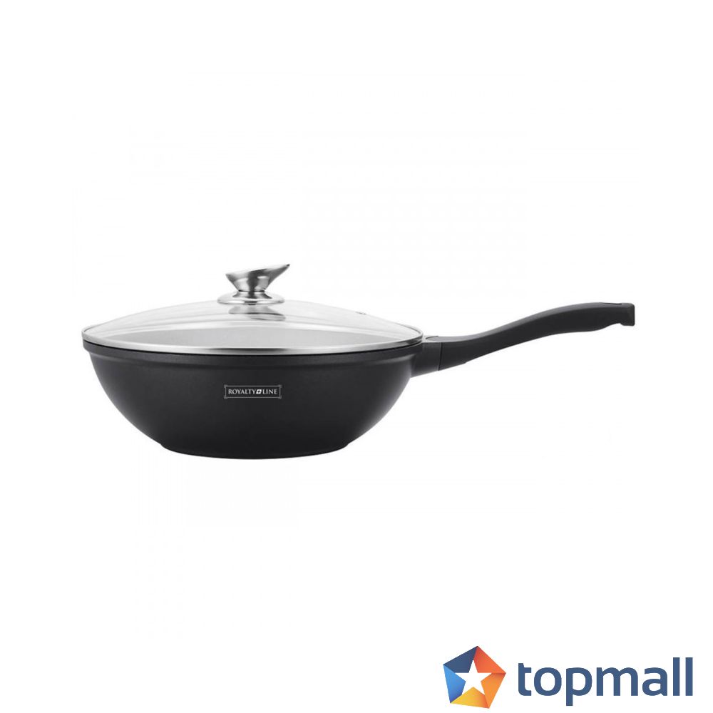 Уок тиган с мраморно покритие ROYALTY LINEВисококачествен уок тиган с мраморно, незалепващо и антибактериално покритие, гарантиращо безопасно и здравословно готвене, запазвайки повечето витамини, минерали и други хранителни вещества. Напълно екологичен продукт без PFOA химикали. Дръжката е Soft-touch - предпазва от изгаряне и е с антиплъзгащо покритие. Стъкленият капак е снабден с отвор за излизане на ненужната пара. Подходящ е за всички видове котлони, включително индукционни и може да се мие в съдомиялна машина.- Диаметър: 28 см