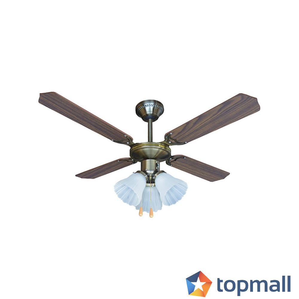42''Вентилатор за таван 3 осветителни тела Диаметър на перките - 105 см. Степени на работа- 3. Брой перки - 4. Брой електричесски крушки - 3х60W. Вид крушки - Е27. Възможност за използване на енергоспестяващи, халогенни, LED или обикновени. Метериал - МДФ. Обратна ротация - да. 55W, 220-240V/50-60Hz.